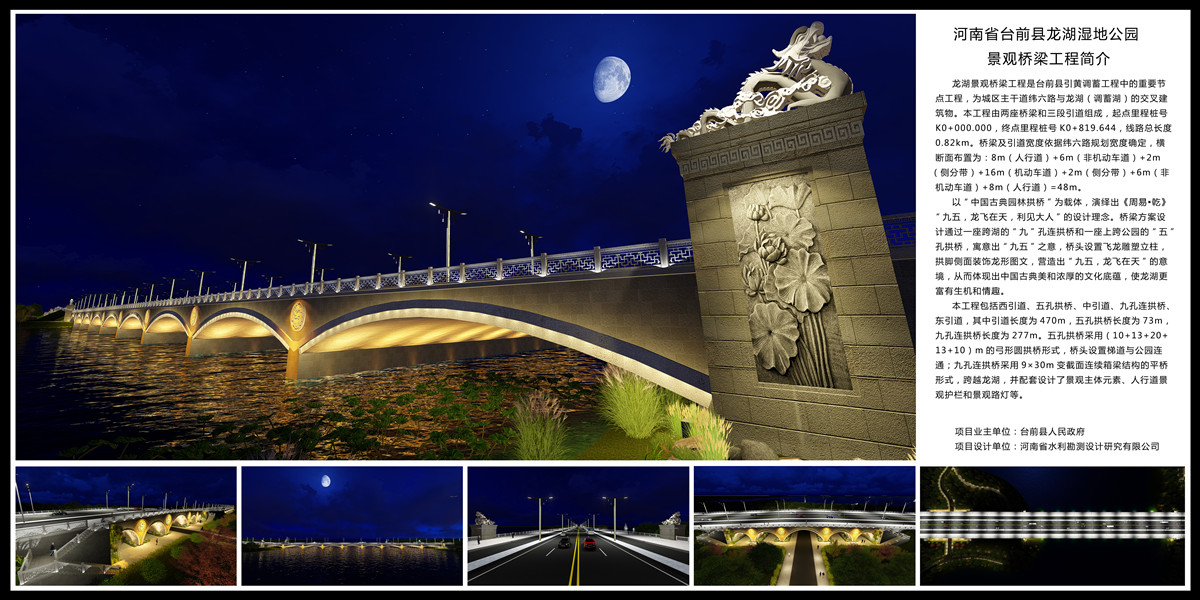臺前縣龍湖濕地公園景觀橋梁工程是臺前縣引黃調(diào)蓄工程中的重要節(jié)點(diǎn)工程,也是龍湖生態(tài)風(fēng)景區(qū)的形象工程,為臺前縣新城區(qū)主干道——緯六路與龍湖及龍湖公園的交叉建筑物。橋梁依據(jù)緯六路規(guī)劃寬度確定總寬48m。工程由兩座橋梁和三段引道組成,線路總長度0.82km,其中五孔圓拱橋跨越龍湖公園,長度69m,采用(10+13+16+13+10)m圓弧拱形式,橋頭設(shè)置梯道與公園連通;九孔連拱橋跨越龍湖,長度278m,采用9×30m的平橋形式,并配套設(shè)計(jì)了景觀主體元素、人行道景觀護(hù)欄和景觀路燈等。