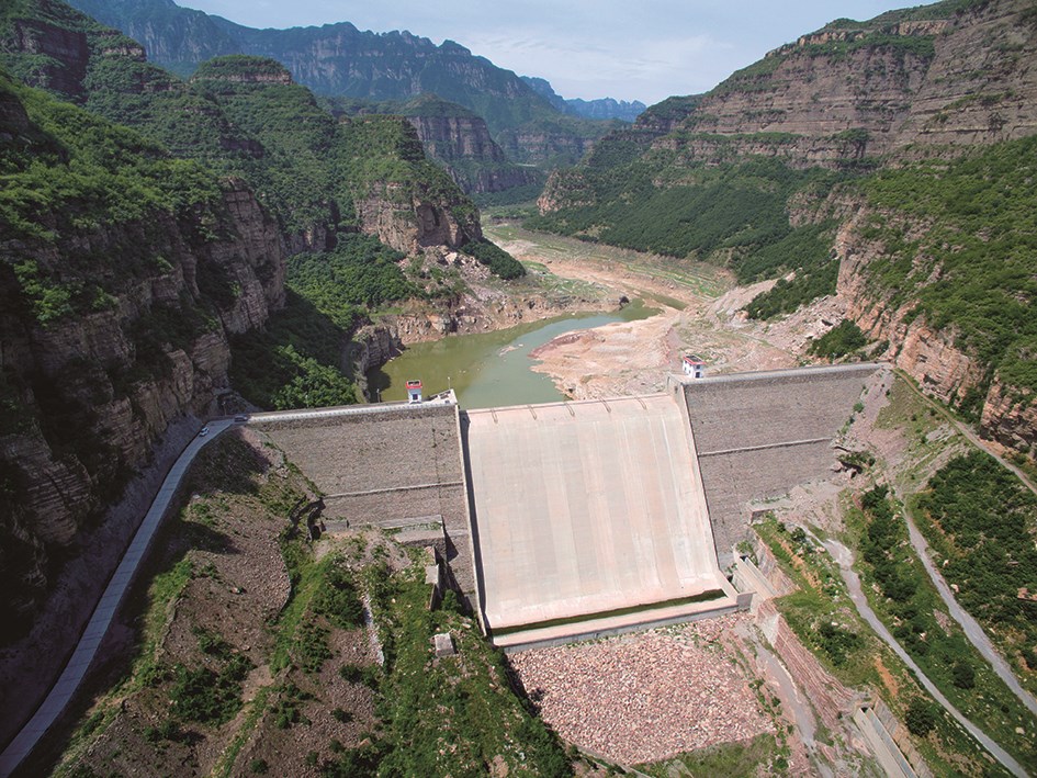 距舉世聞名的紅旗渠約3.6Km,總庫容2795萬m3,每年可向紅旗渠補水約4500萬m3。水庫壩型為混凝土砌石重力壩,最大壩高120.5m,2009年竣工。