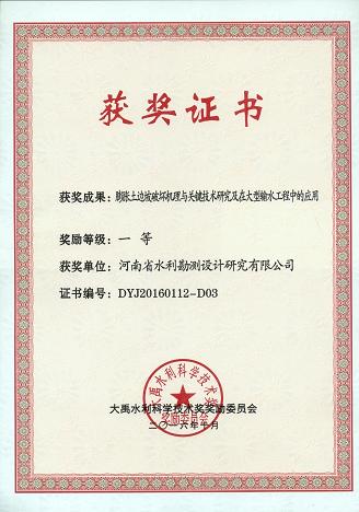 我公司在承擔南水北調中線工程的工程設計任務同時,與長江科學院、南水北調中線建設管理局共同承擔了《南水北調中線膨脹巖渠坡處理技術》等相關的國家“十一五”、“十二五”科技支撐計劃課題。在2016年度大禹水利科學進步獎的評選中,《膨脹土邊坡破壞機理與關鍵技術研究及在大型輸水工程中的應用》科研成果榮獲一等獎,是公司目前所獲最高級別的獎勵。