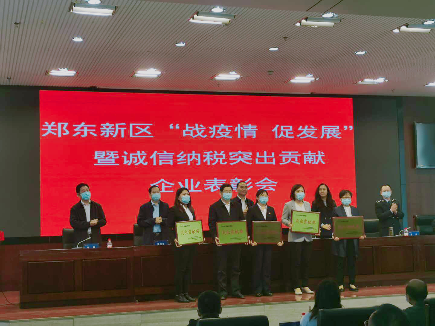 鄭東新區(qū)管委會主任周軍營和鄭東新區(qū)稅務(wù)局局長賈中誼參加會議并頒獎。集團(tuán)公司翟淵軍董事長參加了頒獎儀式,財務(wù)資產(chǎn)部馮海霞部長列席。