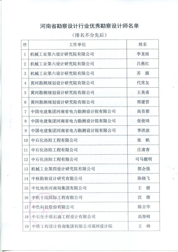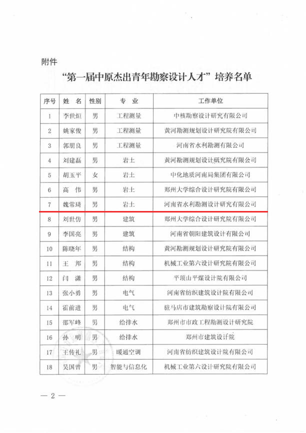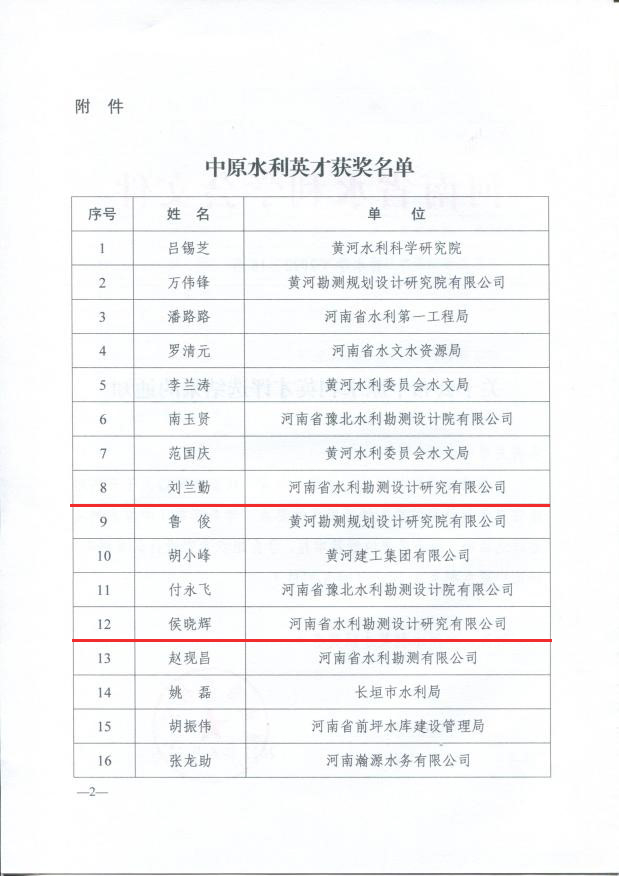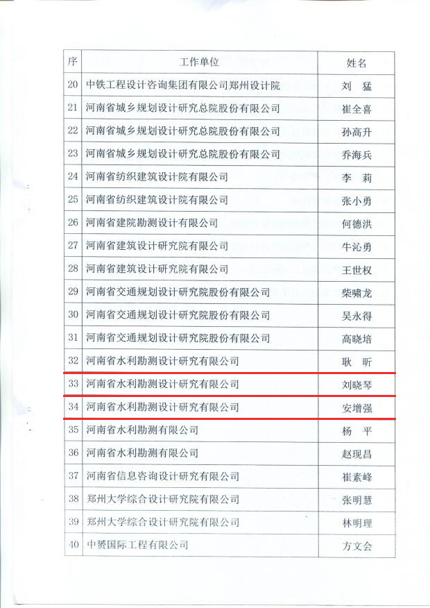 安增強、耿昕、劉曉琴同志獲得河南省勘察設計協會給予的“河南省優(yōu)秀青年勘察設計師”表彰;寧保輝、馬山玉、白勇、魏常琦同志被河南省工程勘察設計行業(yè)協會列入“第一屆中原杰出青年勘察設計人才”培養(yǎng)名單;劉蘭勤、侯曉輝同志被河南省水利學會評為“中原水利英才”。