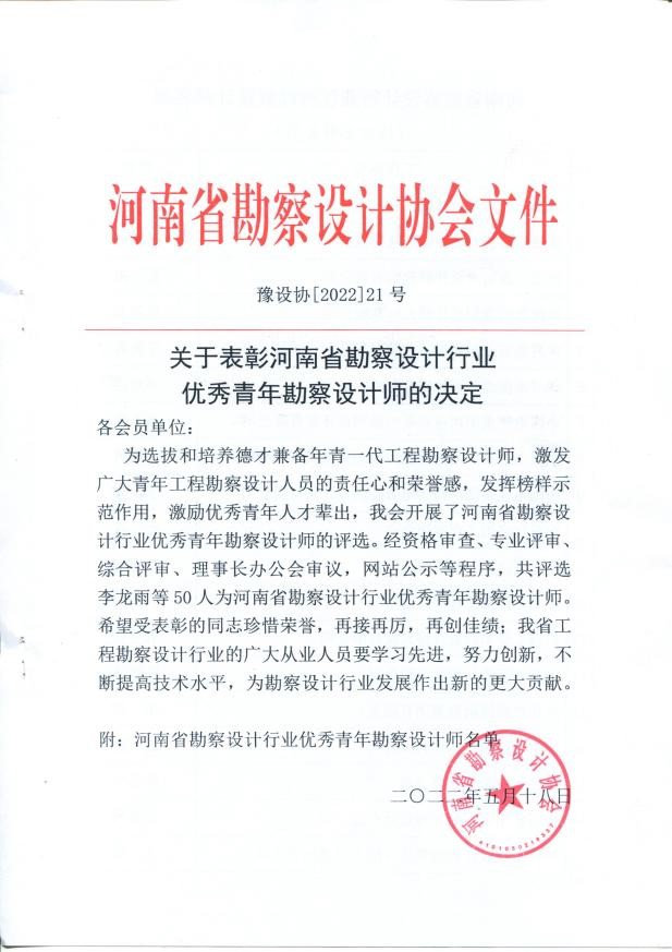 為進一步推動人才強省戰(zhàn)略實施,激勵全省優(yōu)秀青年科技人才建功立業(yè),為著力打造“設計河南”增光添彩,2022新年伊始,河南省勘察設計協會、河南省工程勘察設計行業(yè)協會、河南省水利學會先后舉行全省優(yōu)秀青年人才選拔系列活動。經公司推薦,相關協會、學會評宣,公司安增強等9位同志在眾多申報者中脫穎而出并贏得多項榮譽。