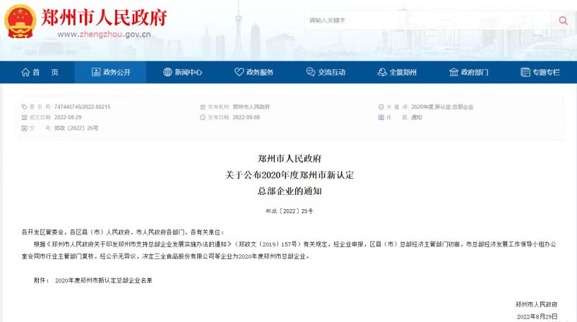 9月8日,鄭州市人民政府公布2020年度鄭州市新認定總部企業33家。其中包含三全食品、鄭煤機、安圖生物等9家上市公司,豫水設計公司榮膺新認定總部企業榜單。