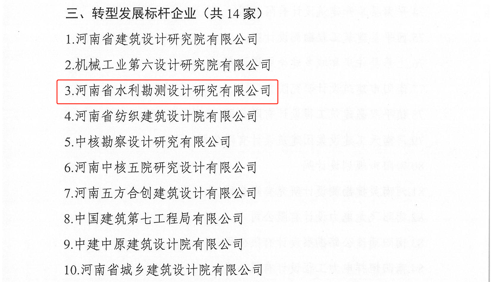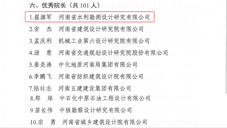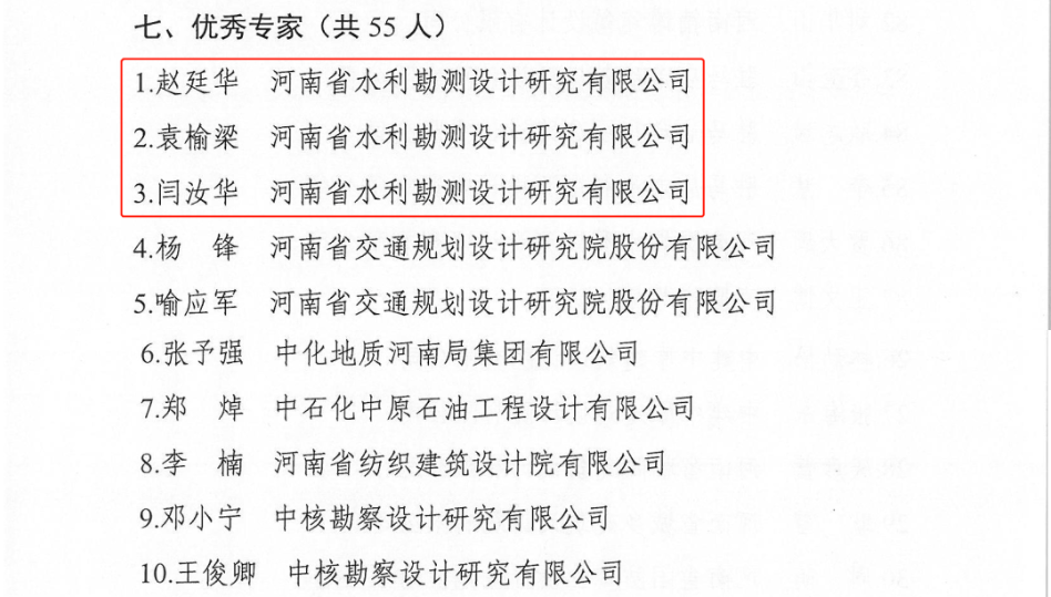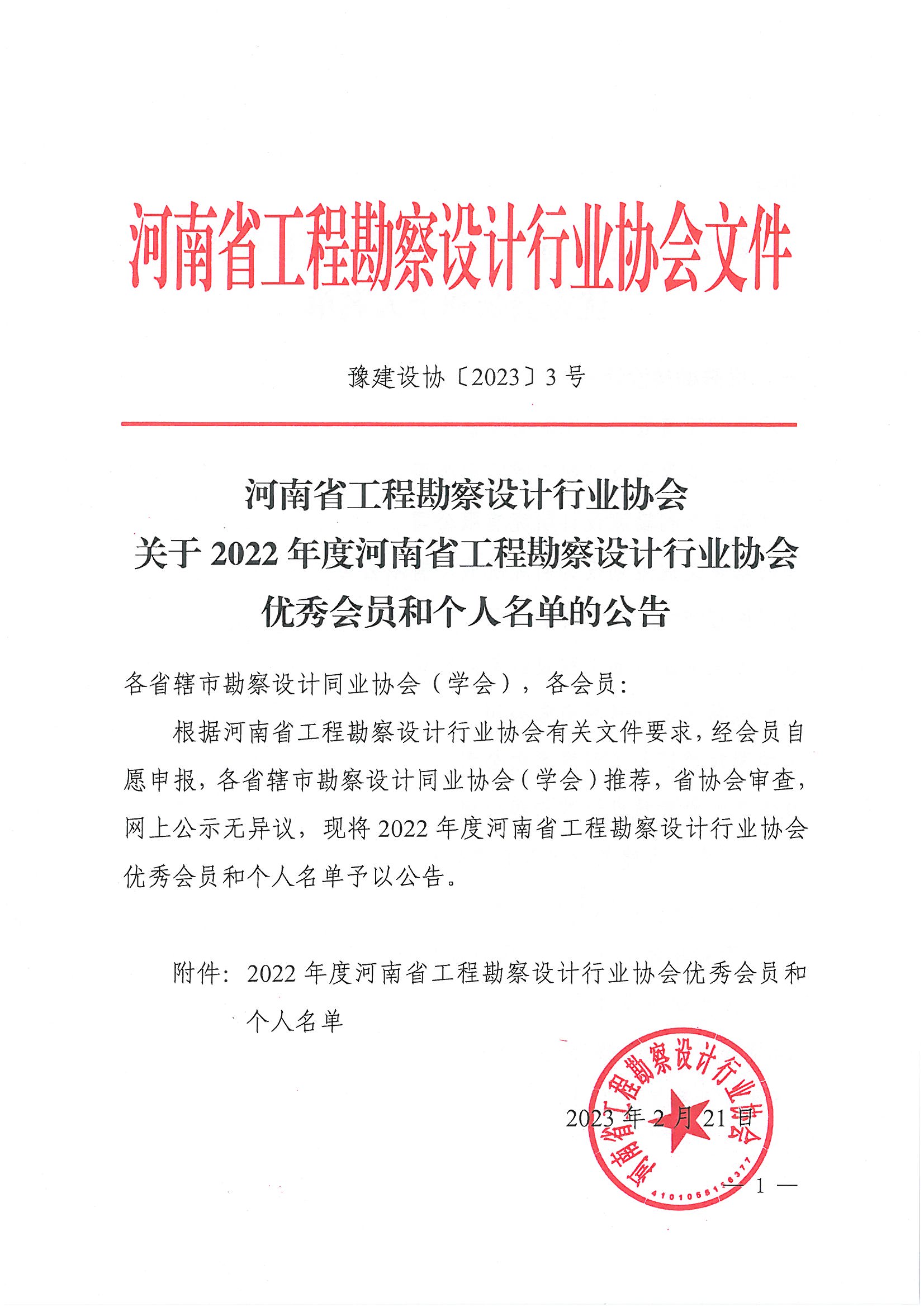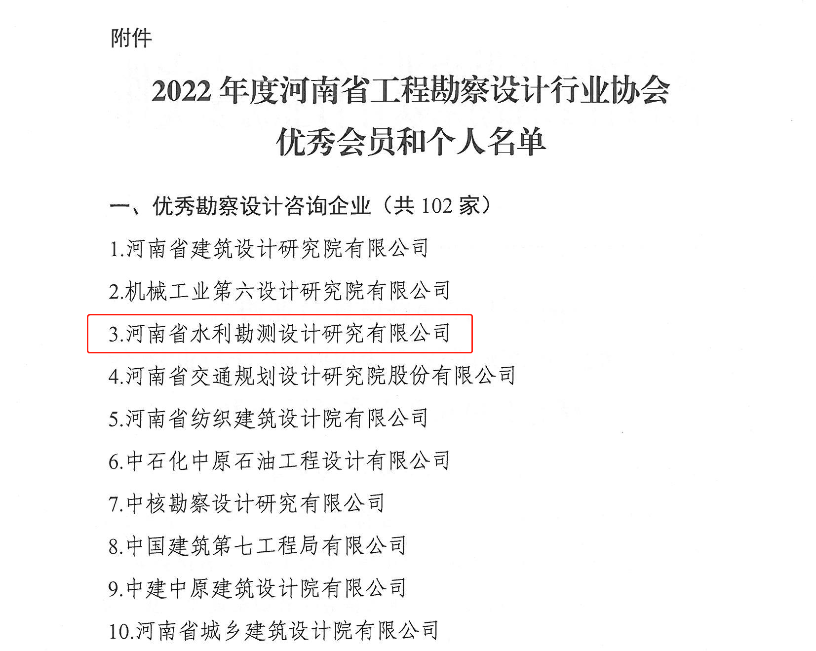 2月21日,由河南省工程勘察設計行業(yè)協(xié)會組織的“2022年度河南省工程勘察設計行業(yè)協(xié)會優(yōu)秀會員和個人名單”評選活動公布結(jié)果,我公司榮獲“優(yōu)秀勘察設計咨詢企業(yè)”、“精神文明先進單位”、“轉(zhuǎn)型發(fā)展標桿企業(yè)”三項榮譽稱號。公司董事長翟淵軍被授予“優(yōu)秀院長”,公司副總經(jīng)理趙廷華、副總經(jīng)理袁榆梁、監(jiān)事會主席閆汝華3名同志被授予“優(yōu)秀專家”。