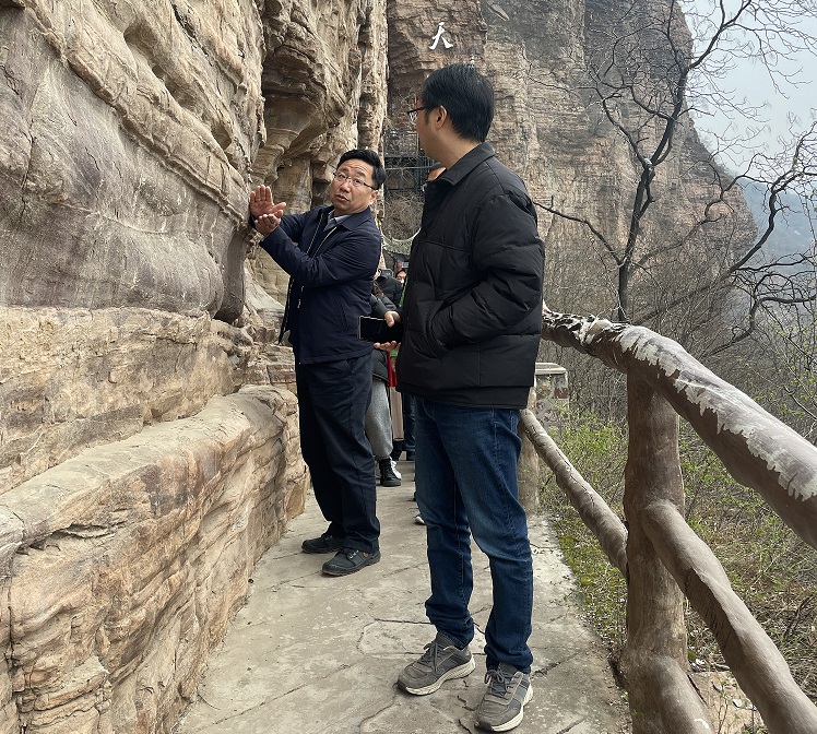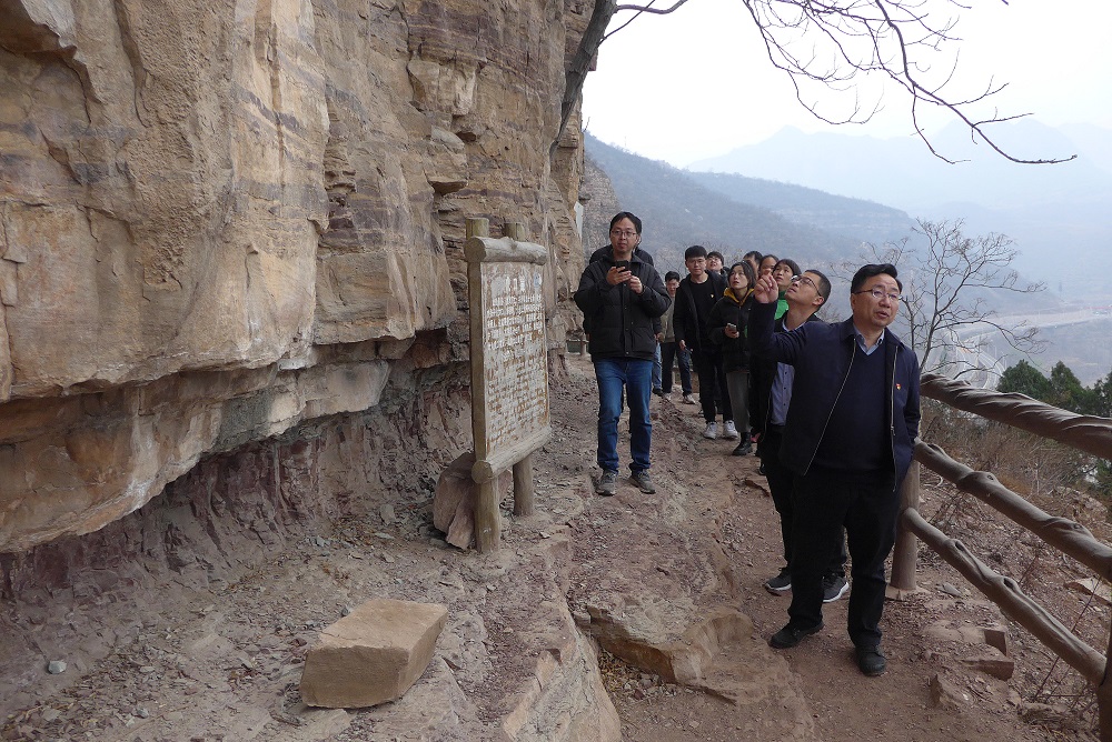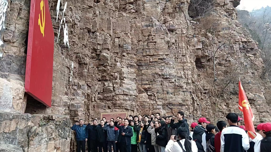 在青年洞,大家沿著“創(chuàng)業(yè)路”拾級(jí)而上,追憶著半個(gè)多世紀(jì)前先輩們?cè)诖藠^斗的足跡:在紅旗渠修建過(guò)程中,300名青年組成突擊隊(duì),經(jīng)過(guò)1年5個(gè)月的奮戰(zhàn),將地勢(shì)險(xiǎn)要、石質(zhì)堅(jiān)硬的巖壁鑿?fù)ǎ@個(gè)輸水隧洞被命名為青年洞。青年洞現(xiàn)場(chǎng),面對(duì)鮮艷的五星紅旗,全體黨員舉起右拳,在支部書(shū)記楊華軍的帶領(lǐng)下,重溫入黨誓詞,堅(jiān)定了我們緊跟總書(shū)記的步伐,奮進(jìn)新征程的信念和決心。