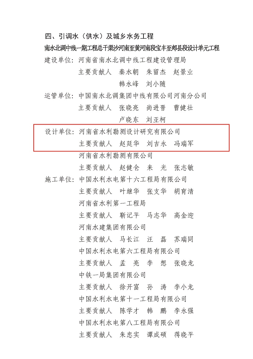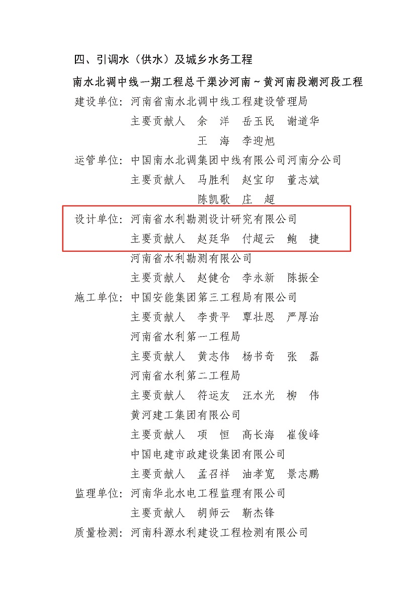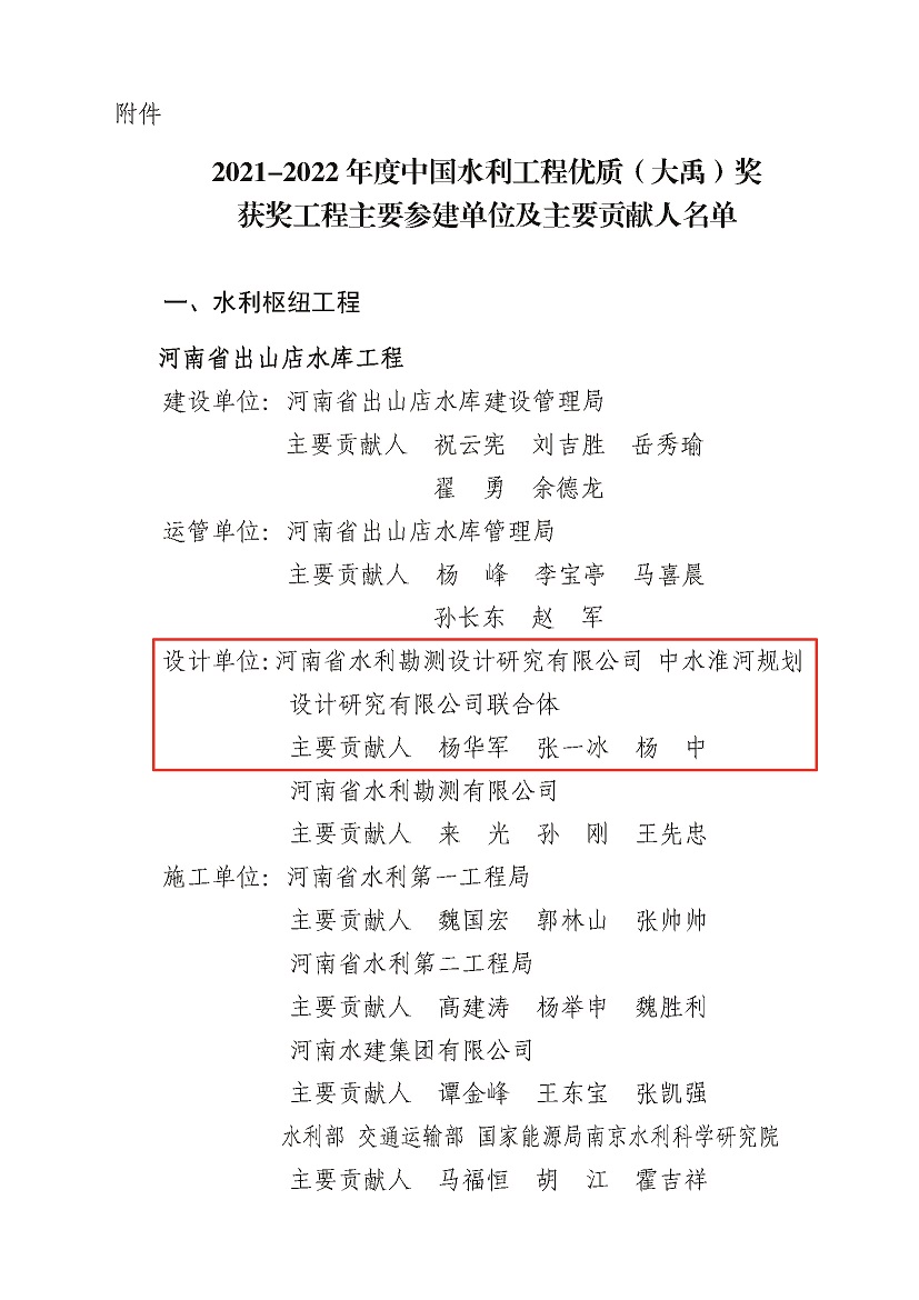 近日,經(jīng)中國水利工程優(yōu)質(zhì)(大禹)獎評審委員會評審及公示,公司參與設(shè)計的《河南省出山店水庫工程》《南水北調(diào)中線一期工程總干渠沙河南~黃河南段潮河段工程》《南水北調(diào)中線一期工程總干渠沙河南至黃河南段寶豐至郟縣段設(shè)計單元工程》三項工程榮獲2021-2022年度中國水利工程優(yōu)質(zhì)(大禹)獎。