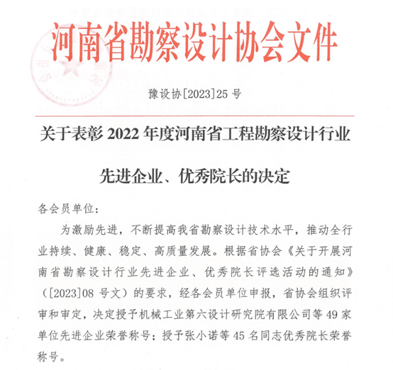 近日,河南省勘察設(shè)計協(xié)會發(fā)布《關(guān)于表彰2022年度河南省工程勘察設(shè)計行業(yè)先進企業(yè)、優(yōu)秀院長的決定》,公司榮獲“2022年度河南省勘察設(shè)計行業(yè)先進企業(yè)”稱號,公司董事長翟淵軍同志被評為“2022年度河南省勘察設(shè)計行業(yè)優(yōu)秀院長”。