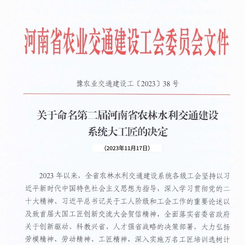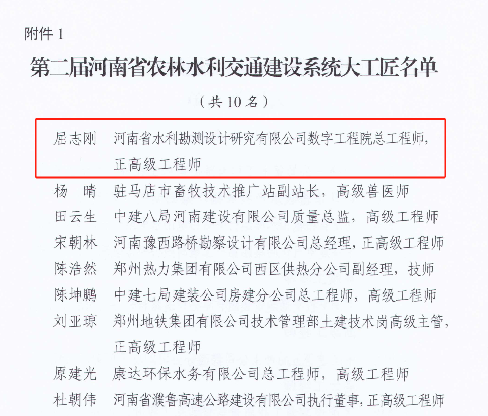 11月17日,河南省農(nóng)業(yè)交通建設(shè)工會(huì)委員發(fā)布命名決定,豫水設(shè)計(jì)公司數(shù)字工程院總工屈志剛同志被命名為第二屆河南省農(nóng)林水利交通建設(shè)系統(tǒng)大工匠,獎(jiǎng)勵(lì)個(gè)人1萬(wàn)元。本屆評(píng)選,由公司申報(bào)、水投集團(tuán)推薦,屈志剛同志從眾多申報(bào)者中脫穎而出,為公司贏得榮譽(yù)。