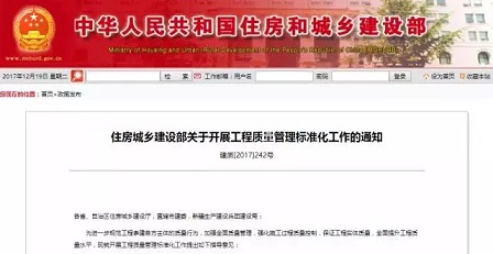 近日,住建部下發《住房城鄉建設部關于開展工程質量管理標準化工作的通知》(以下簡稱《通知》)。提出到2020年底,要力爭“全面推行工程質量管理標準化”。