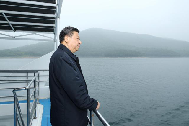 習近平總書記佇立船頭,他的目光望向煙波浩渺的水、望向林木蔥郁的山。