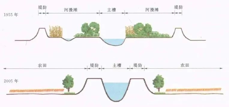 圍墾河漫灘+堤防縮窄河道示意圖