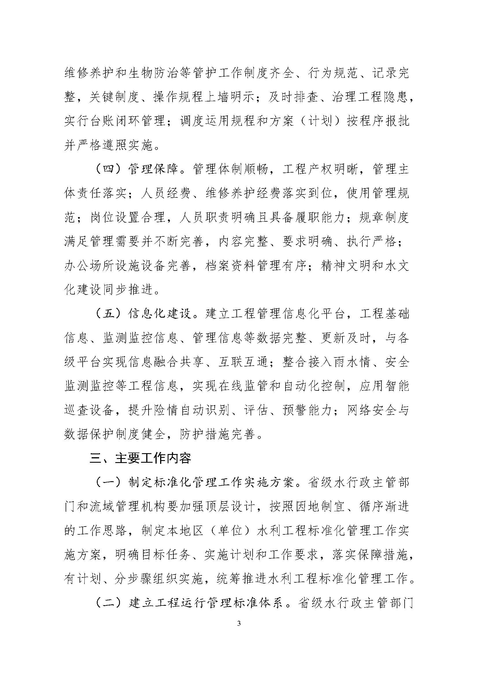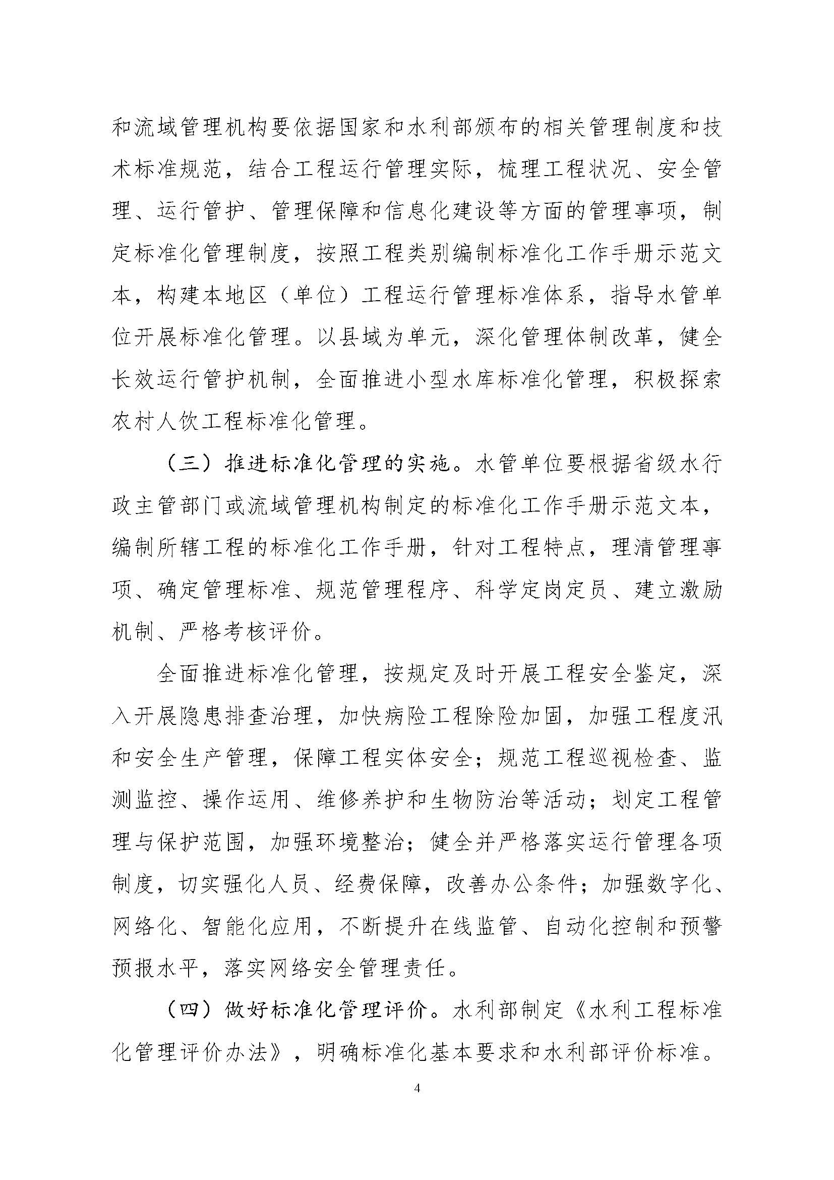 《指導意見》強調,要落實管理責任,規范管理行為,提高管理能力,在工程狀況、安全管理、運行管護、管理保障和信息化建設等5個方面滿足標準化管理要求。《指導意見》還確定了制定實施方案、建立運行管理標準體系、推進標準化管理的實施、做好標準化管理評價等工作步驟和具體內容,提出了保障措施。