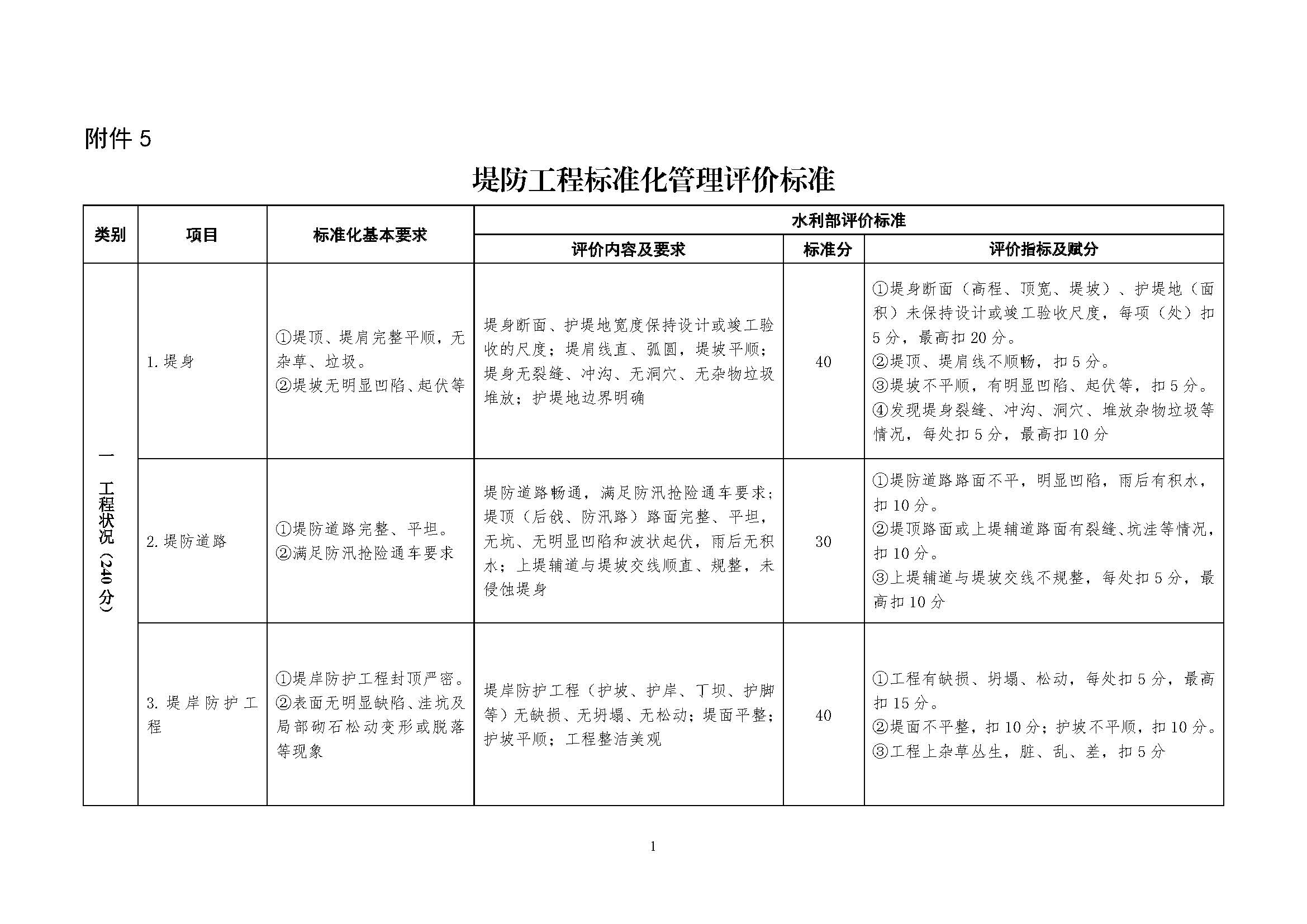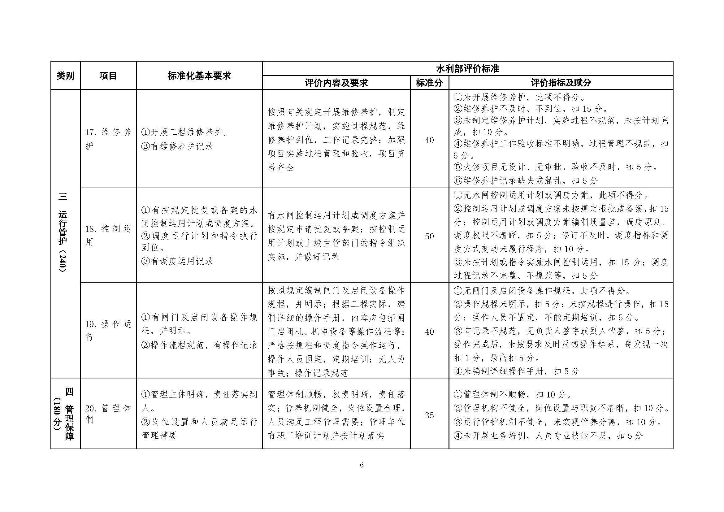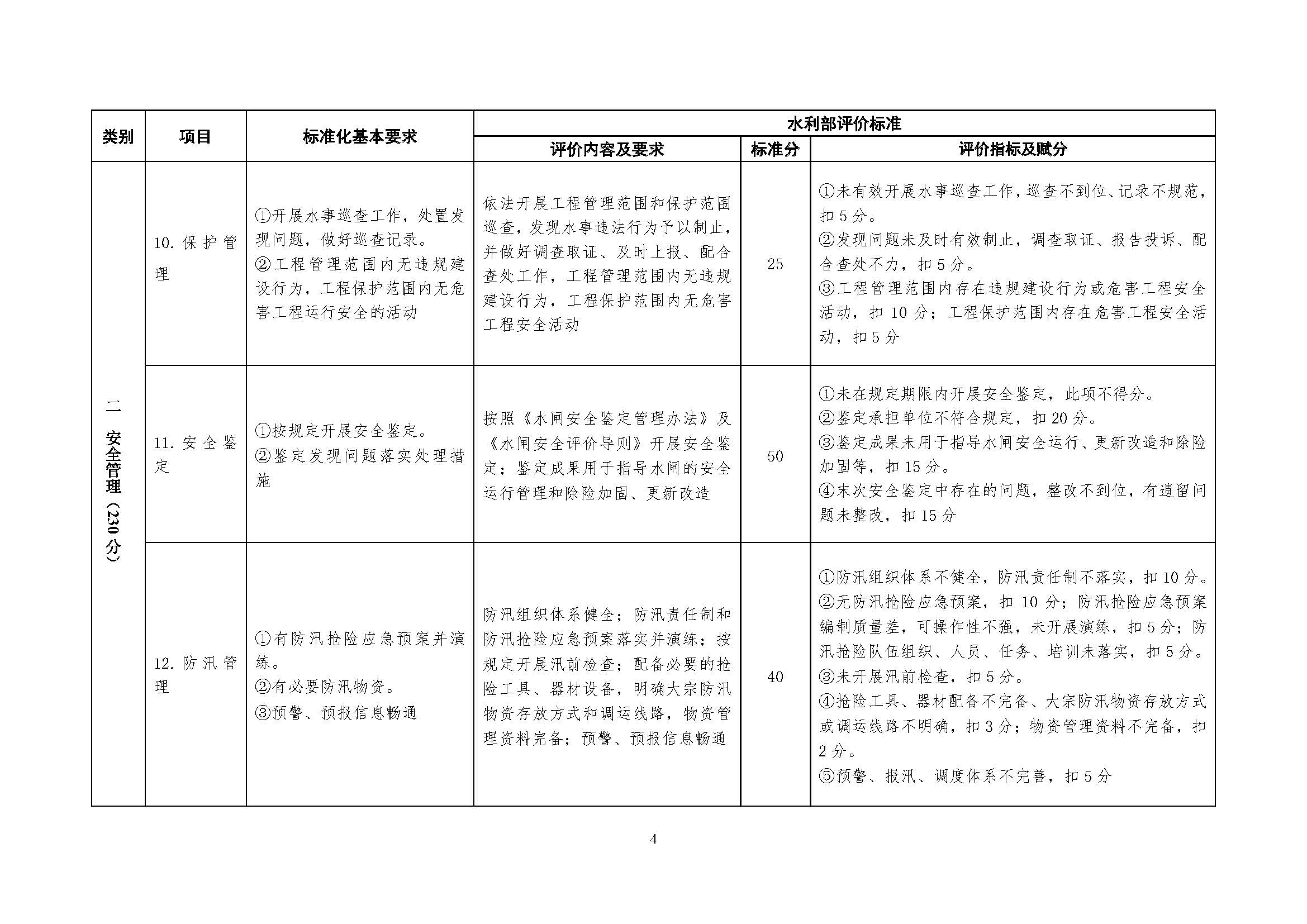 與《指導意見》相配套,同時印發了《評價辦法》及其評價標準,對標準化評價的適用范圍、評價主體、評價程序等作出規定,包括大中型水庫、大中型水閘、3級以上堤防評價標準。