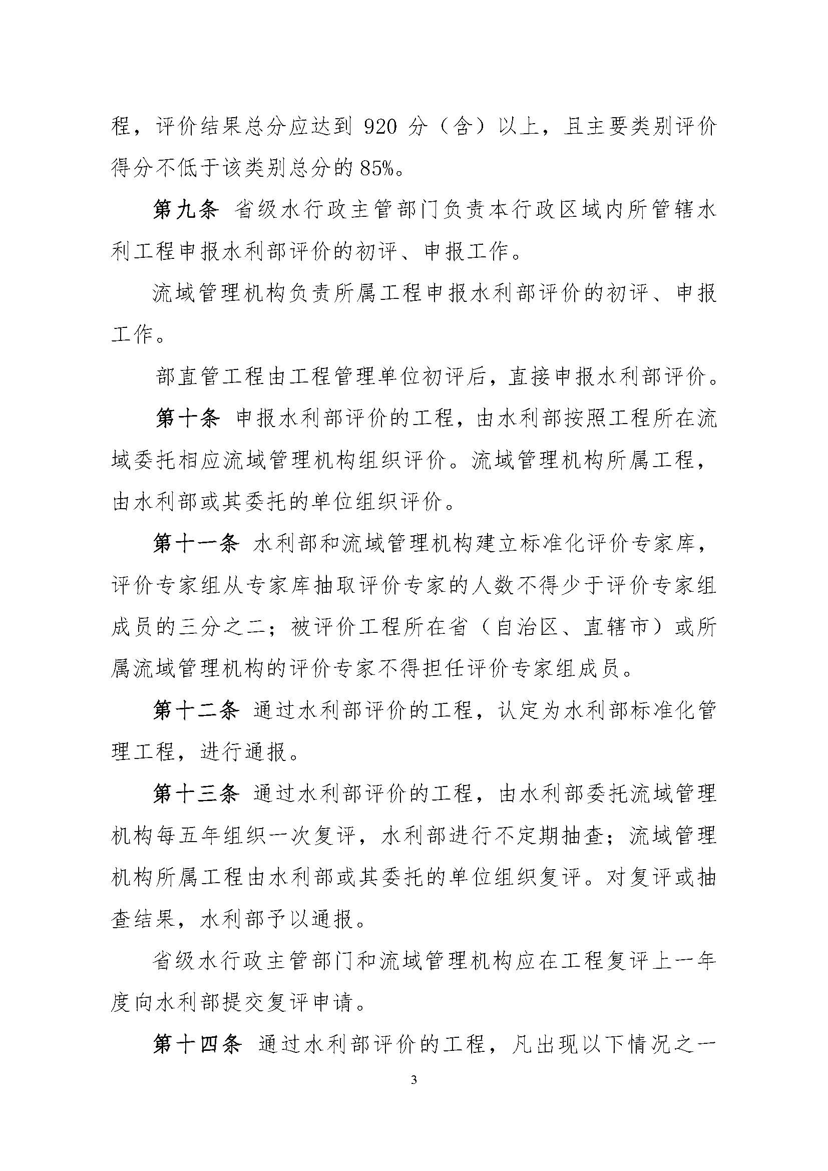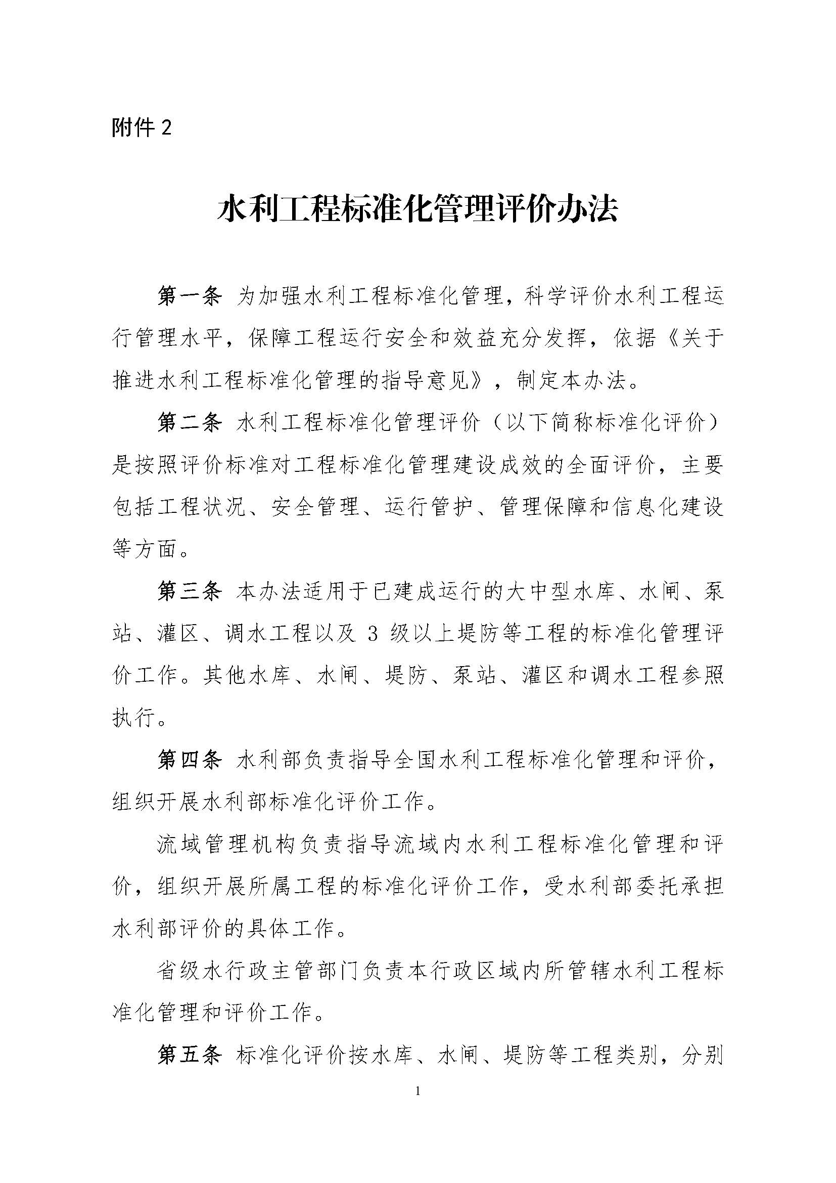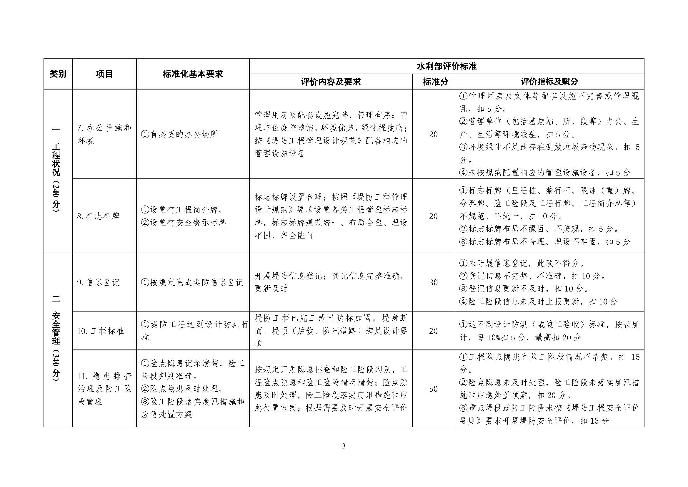 與《指導意見》相配套,同時印發了《評價辦法》及其評價標準,對標準化評價的適用范圍、評價主體、評價程序等作出規定,包括大中型水庫、大中型水閘、3級以上堤防評價標準。
