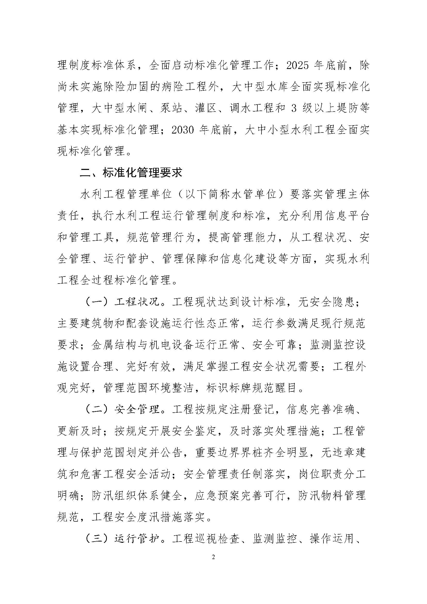 《指導意見》明確了推進水利工程標準化管理的指導思想和總體目標,要求2022年底前,省級水行政主管部門和流域管理機構建立起水利工程標準化管理制度標準體系,全面啟動標準化管理工作;2025年底前,除尚未實施除險加固的病險工程外,大中型水庫全面實現標準化管理,大中型水閘、泵站、灌區、調水工程和3級以上堤防等基本實現標準化管理;2030年底前,大中小型水利工程全面實現標準化管理。