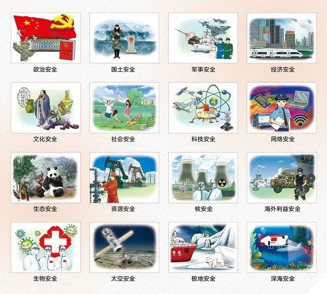 至此,我國國家安全領域主要包括:政治安全、國土安全、軍事安全、經濟安全、文化安全、社會安全、科技安全、網絡安全、生態安全、資源安全、核安全、海外利益安全、生物安全、太空安全、極地安全、深海安全。