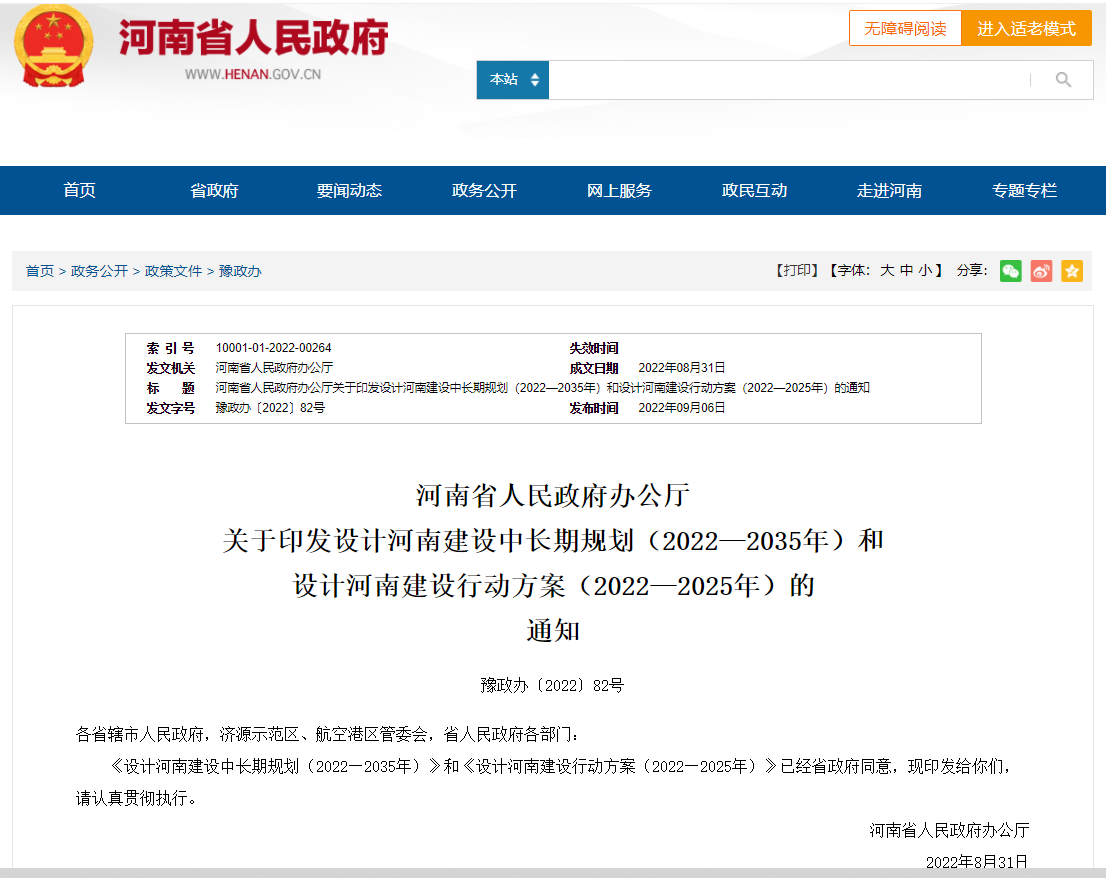為認(rèn)真落實河南省第十一次黨代會精神,加快打造設(shè)計河南,為經(jīng)濟社會高質(zhì)量發(fā)展提供重要支撐,9月7日,河南省人民政府辦公廳發(fā)布《設(shè)計河南建設(shè)中長期規(guī)劃(2022—2035年)》和《設(shè)計河南建設(shè)行動方案(2022—2025年)》。